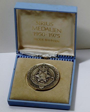 Sirius-medaillen 1975 af sterlingsølv, designet af Frode Bahnsen, udført i Finland for Anders Nyborg A/S. På obv. står der: "Nord-Øst Grønland 1950-1975". Ø. 50 mm.