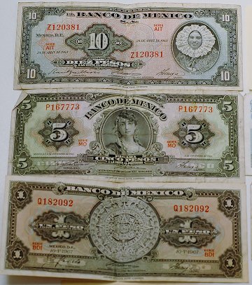Lot med 11 blandede sedler fra Danmark, Sverige, Belgien og Mexico.
