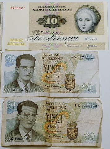 Lot med 11 blandede sedler fra Danmark, Sverige, Belgien og Mexico.