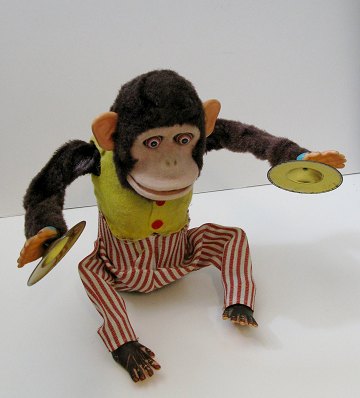 Daishin Japan, mekanisk legetøjsabe af plys og kunststof, iklædt tøj af stof. Aben spiller på cimbaler. Batteridreven vintage legetøj fra midten af 1950'erne. L. ca. 37 cm.