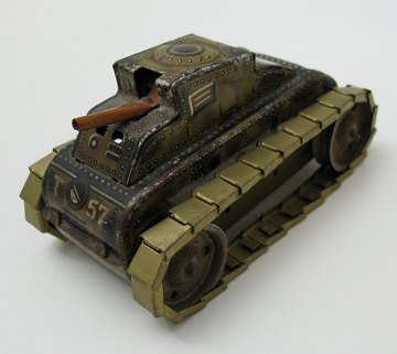 GAMA Nürnberg, mekanisk legetøjstanks med urværksmotor, model T-57 med gnistkanon. L. ca. 11 cm.