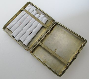 Russisk cigaretetui fra 1895 af sølv, stemplet kyrilsk RK , 84, årstal 1895 samt Skt. Georg med dragen. På forsiden gravure med den tyske rigsørn med svastica, omkranset af bladværk og dødningehoved samt påskrift Der Reichsführer SS. På bagsiden "Zu lang haben wir vergessen, dass wir Germanen sind! og signaturefterligning "Heinrich Himmler". Formodentlig krigsbytte fra Ruslandkrigen som er blevet "germaniseret" med de nævnte indscriptioner. 7,5 x 8,5 cm. Vægt ca. 136,5 gr.