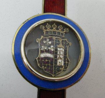 Østrigsk cigaretetui af sølv, pragtfuld dekoreret med art deco stil emeillebelægninger i hvide, borderauxrøde og koboltblå farver. Ydermere ilagt våbenskjold af Prinz zu Oldenburg, prydet med safirer, rubiner og diamanter. Etuiet er stemplet med Dina hoved og mestermærke af kongelig hofjuveler og indvendig graveret med L. Schuch's Nachf., Wien. Ca. 70 x 10 cm.