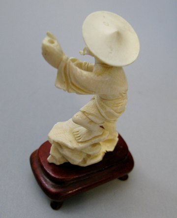 Kinesisk figur i form af munk som bestiger et bjerg på 4-benet, profileret fod af lakeret ædeltræ. H. ca. 10 cm.