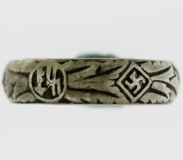 Original SS-ring, en såkaldt "Totenkopf"-ring, der blev tildelt SS-officerer af Reichsführer-SS Heinrich Himmler, hvorfor også hans navn er at finde indgraveret i ringen. Str. 64 1/2.