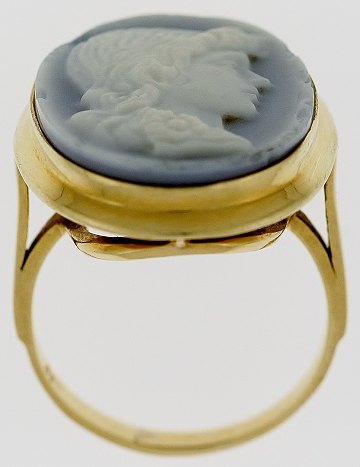 Ring af 14 kt. guld, prydet m. udskåret lyseblå camé, forestillende en ung dame i profil. Str. 51.
