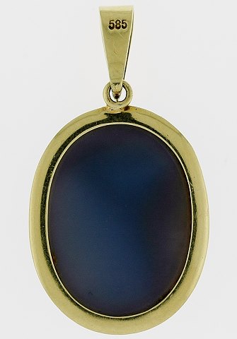 Vedhæng af 14 kt. guld, prydet m. udskåret lyseblå camé, forestillende en ung dame. H. 3,2 cm (inkl. øsken).