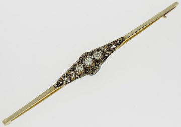 Broche af 14 kt. delvist rhodineret guld, prydet m. tre større brillantslebne diamanter samt talrige mindre diamantroser på ialt ca. 0,30 ct. L. 7,4 cm.