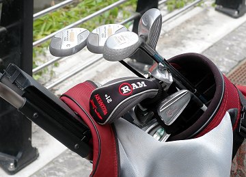 Golfudstyr m. bag og trolley, bestående af 7 køller, 7 jern samt én putter, bl.a. en fairway wood af mærket RAM.