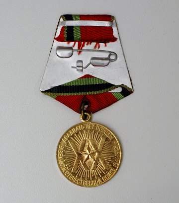 Russisk erindringsmedaille af forgyldt metal til minde om 20-års sejren i den store fædrelandskrig 1941 - 1945, indstiftet 7.5.1965. L. med bånd ca. 8,5 cm.