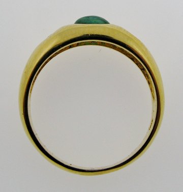 Ring af 18 kt. guld, prydet med cabochonsleben smaragd, flankeret af to pæne brllantslebne diamanter, tilsammen ca. 0,08 ct. Ring Str. 54½, samlet vægt ca. 5,0 gr.