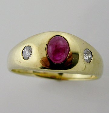 Ring af 14 kt. guld, prydet med tværliggende, cabochonsleben rubin, flankeret af to brillantslebne diamanter, tilsammen ca. 0,10 ct. Ring Str. 53½, samlet vægt ca. 4,1 gr.