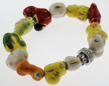 Populært kinesisk armbånd m. håndlavede keramikperler – dyrekredsens tolv dyr -, hvilke er håndmalede og specialfremstillede i det nordøstlige Kina, samt swarovski krystaller eller halvædelstene og IP forgyldt metal.