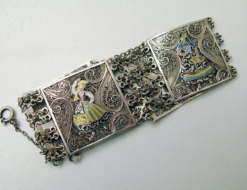 Flot armlænke i sjælden udført filigranarbejde af sølv med emailledekorationer i form af kvinder i sydlandske folkedragter. L. ca. 20 cm., 20. årh. begyndelse.