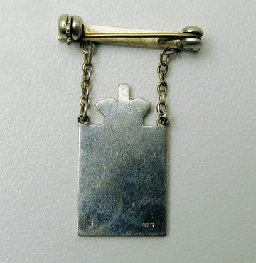 Kongenål af sterlingsølv, prydet m. farvet emalje. Stemplet "GJ" for Georg Jensen samt "925".