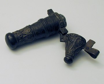 Pistil med indvendig hul korpus og hængslet lukke, beregnet til opbevaring af blandingspulver. Rigt dekoreret med rosetter, omløbende sløjfe og bladdekorationer. Pistilbeholderen har formodentlig sin oprindelse i det 18. århundrede. L. ca. 12 cm.