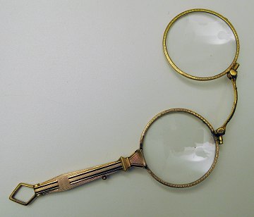 Et par lorgnetter med profileret, mønsterdekoreret holder og stel, prydet med sort emaille. Stemplet O.L., glasstyrke ca. 2,0+