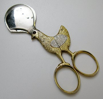 Antik æggesaks af forgyldt metal i form af hane, stemplet "Dreizack Solingen Germany" og 54. L. ca. 13,5 cm.