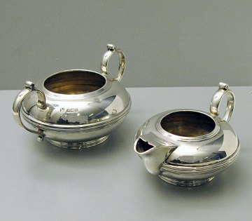 Engelsk empire sukker- og flødesæt af sterling sølv, stemplet med krone, lion passant og årsbogstav "u" samt W.F-A.F Sheffield 1840. Samlet vægt ca. 312 gr.
