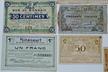 Mindre samling franske (og en enkelt belgisk) nød- og privatpengesedler fra tiden lige før, under og efter 1. Verdenskrig. Ialt 18 stk.