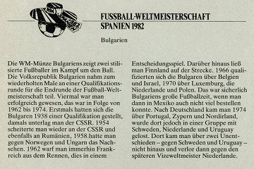 Bulgarien, 10 leva sølv 1982 ucirkuleret, udgivet i anledning af fodbold verdensmesterskabet 1982 i Spanien, ilagt i plasticcharteque med beskrivelsen af Bulgariens fodboldhistorie samt andre oplysninger. Finsølvindhold ca. 12,3 gr.
