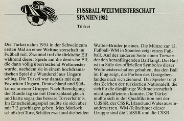 Tyrkiet, 500 lira Sterling sølv 1982 proof, udgivet i anledning af fodbold verdensmesterskabet 1982 i Spanien, ilagt i plasticcharteque med beskrivelsen af Tyrkiets fodboldhistorie samt andre oplysninger. Finsølvindhold ca. 21,5 gr.
