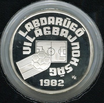 Ungarn, 500 forint sølv 1982 proof, udgivet i anledning af fodbold verdensmesterskabet 1982 i Spanien, ilagt i plasticcharteque med beskrivelsen af Ungarns fodboldhistorie samt andre oplysninger. Finsølvindhold ca. 18,1 gr.