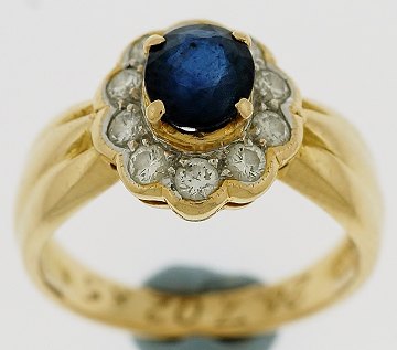 Ring af guld, formodenlig 14 kt., prydet m. facetsleben safir, hvilken der er omkranset af 10 brillantslebne diamanter på ialt ca. 0,50 ct. Str. 52 1/2.