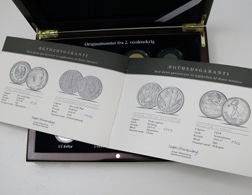 Møntsætter indeholder 10 originale krigs- og besættelsesmønter fra Tyskland, USA, Sovjetunionen, Frankrig, England og Danmark.