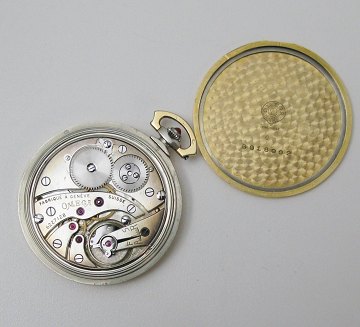 Omega, elegant lommeur i kasse af guld, skive og kroneknop med koraldekorationer, sort krans med arabertal og minutinddeling i guld samt separat sekundviser. Bagkapsel af guld med fabriksfremstillet monogram. Dia. 43,6 mm.