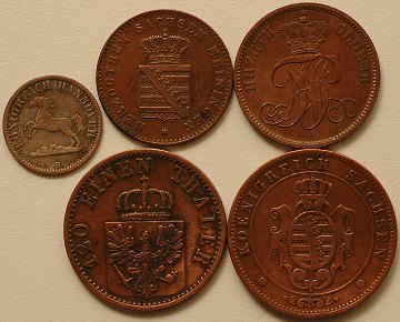 Lot bedre tyske småmønter af kobber, bestående af: Hannover, 1/2 groschen 1856B, Sachsen-Meiningen, 2 pfennig 1866, Oldenburg, 3 schwaren 1866B, Preussen, 3 pfennig 1871C samt Sachsen, 5 pfennige 1869B.