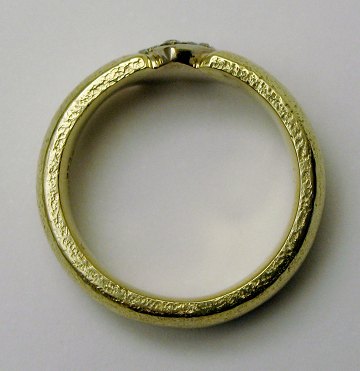Ring af 14 kt. guld, prydet med 10 brillanter, tilsammen 0,16 ct. i hjerteformet fatning. Ringskinne med struktureret overflade, Str. 53, samlet vægt ca. 10,6 gr.