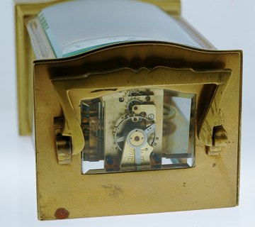 Fransk rejseur af messing med glas, urskive af emaille med arabertal, sorte visere. Urets glassider gør det muligt at se værket fra fire vinkler. Værk mærket Made in France. Ca. 1900. H. 11 cm.