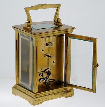 Fransk rejseur af messing med glas, urskive af emaille med arabertal, sorte visere. Urets glassider gør det muligt at se værket fra fire vinkler. Værk mærket Made in France. Ca. 1900. H. 11 cm.