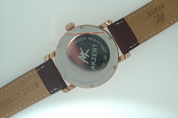 Ubrugt herrearmbåndsur fra Akzent, i kasse af rosaforgyldt stål, perlemorsskive m. romertal, månefaseindikator, måned-, dato- og ugedagsangivelse, mineralglas, original læderrem, quartzurværk. Ø. 39,5 mm (u. krone).