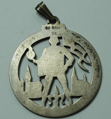 Vedhæng af sølv, udført m. gennembrudte felter, bagpå stemplet "830S". Ø. 44,6 mm.