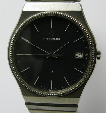 Eterna Quartz herrearmbåndsur i kasse af stål. Sort skive med stregindikation og dato i #3 positionen. Diam. ca. 34,5 mm.