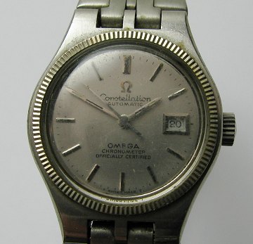 Omega Constellation damearmbåndsur af stål med stålfarvet skive med stregindikation og dato i #3 position. Diam. ca. 25,5 mm. Stållænke med flip-lock.