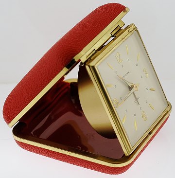 Dekorativt rejseur af mærket Europa, i kasse af messing, cremefarvet skive, delvist m. stregindeks og arabertal, alarmfunktion, manuelt optræk, ydrekasse af hård rød plast. Mål m. ydre kasse: 7,5 x 7,5 cm.