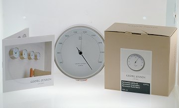 Nyt og ubrugt barometer fra Georg Jensen, designet af Henning Koppel, i kasse af stål, hvid skive m. arabertal. Ø. 10 cm.