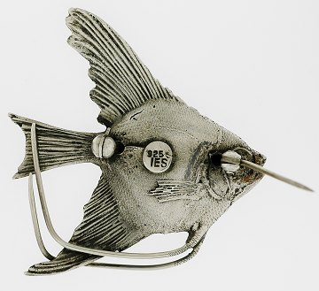 Usædvanlig veludført broche af sterlingsølv fra den københavnske sølvsmed Ingild E. Sørensen (1946-88), detailleret udformet som fisk. L. 46 mm.