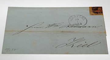 4 R.B.S orangebrun. Stemplet "Neustadt 10-1-1855" og sendt til Kiel.