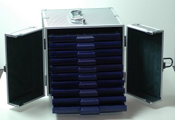 Møntkasse fra Leuchtturm m. 10 møntskuffer. Mål: 22 x 22 x 27 cm.