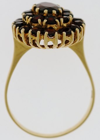 Ring af 14 kt. guld, prydet m. facetslebne granater indfattede i "H"-formede grabber. Str. 61.