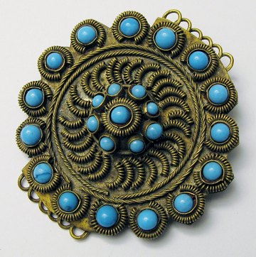 Antik arabesque broche i form af roset med forhøjet front, prydet med perler af turkis. Diam. ca. 60 mm. Mellemøsten, 19. årh. slutning.