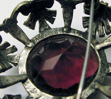 Skønvirke Miracle broche af forsølvet metal, dekoreret med stjernefacetteret ametystfarvet sten. Diam. ca. 46 mm. stemplet Miracle, 19. årh. slutning.