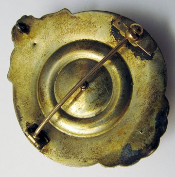 Antik broche af delvis forgyldt metal, dekoreret med volutter og sløjfe samt onyxfarvet sten med blomstroset. Ca. 43 x 36 mm. Formodentlig Frankrig omkring 1880.