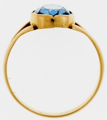 Ældre ring af guld (syreprøvet til 14 kt.), formentlig prydet m. facetteret topas. Indvendig graveret. Str. 57.