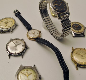 Samling Vintage dame- og herrearmbåndsure på i alt 8 stk. fra midten af det 20. årh. Heriblandt fabrikater som Junghans, Germinal, Orano, Chronel m.v. Alle i urkasse af metal med optræksværk, nogle forgyldt.