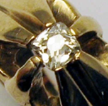 Ring af 14 kt. guld, forhøjet skinne prydet med fin, diamantsleben brillant på ca. 0,16 ct. Str. 58½. Samlet vægt ca. 4,5 gr.
